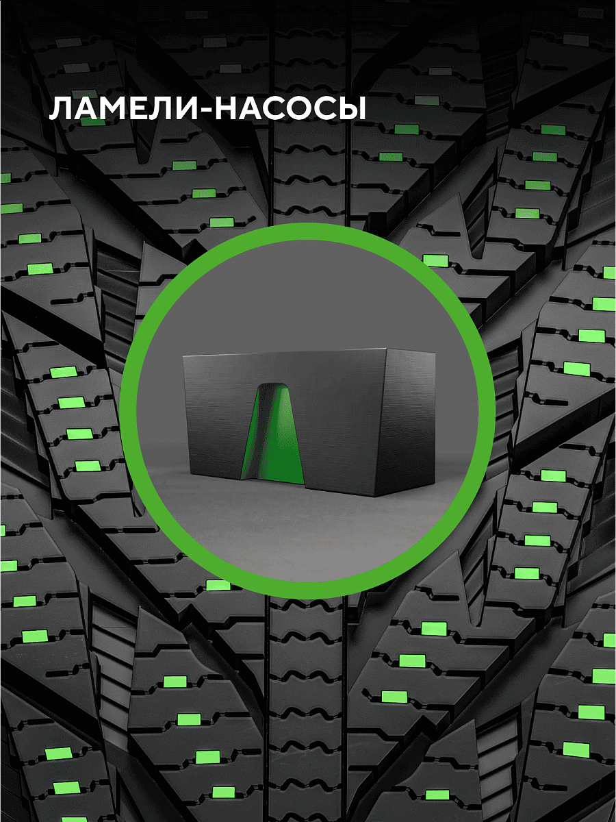 Снижение риска аквапланирования и улучшенное сцепление на скользких покрытиях обеспечиваются за счет ламелей-насосов, которые втягивают водную пленку с пятна контакта.