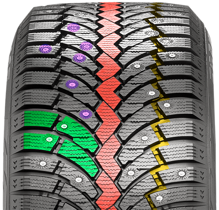 2.       СПЕЦИАЛЬНАЯ ФОРМА ШИПА - надежная посадка и сохранность шипов в течение всего срока эксплуатации шины. Высокий уровень сцепления на обледенелых поверхностях за счет хорошей проницаемости сердечника шипа в лед.